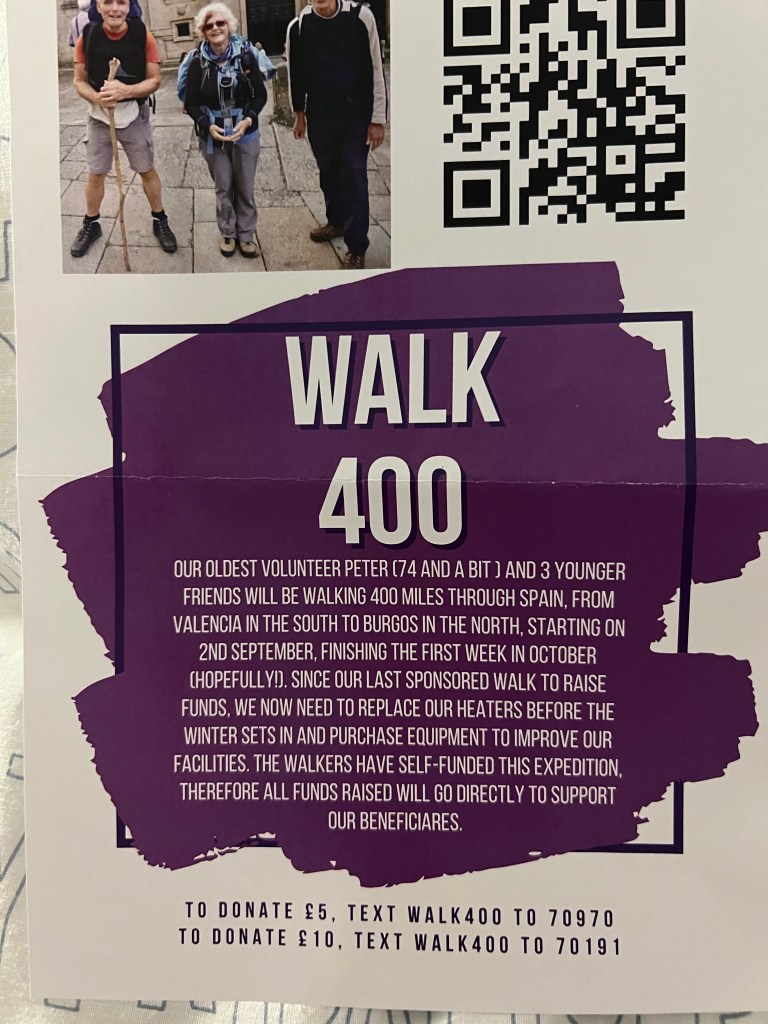 Ever the optimists and with Andy’s dogged planning skills we will make it happen. I am booked to fly on the 30 th August to Madrid and then train to Valencia. The others will arrive on the 1st September. A few days exploring Valencia and then we start walking. We are prepared to be flexible, in fact already we are finding alternatives on our route. This is not a well travelled road like the traditional Camions and consequently accommodation is a bit limited. Being a group of four has made it difficult to just wander into towns as we have done previously.