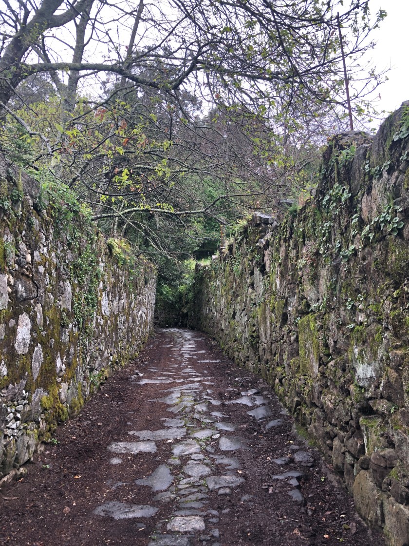 The path was more varied with muddy patches, rocky tracks and our nemesis the cobblestones. Lots of winding lanes and mossy walls. We could see glimpses of the sea at times and even hear the surf. It was a pretty walk.